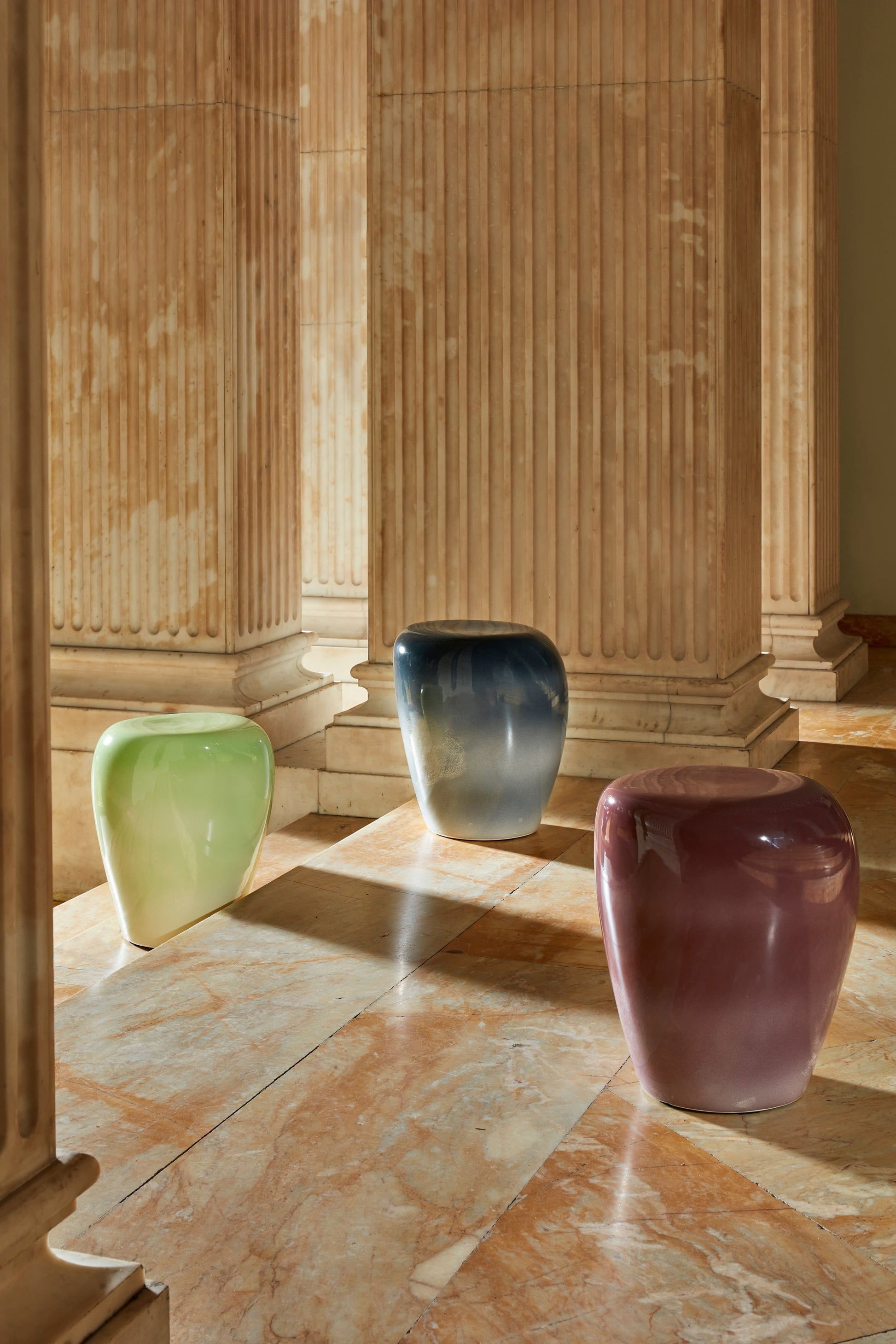 Willo is a glazed stoneware accent stool in an elusive shape. Like an apparition frozen in light, halfway between a swamp light and a sculpted monolithic stump. Suitable for both indoor and outdoor use, the piece is perfect to sit on, but may also be used as a side table.