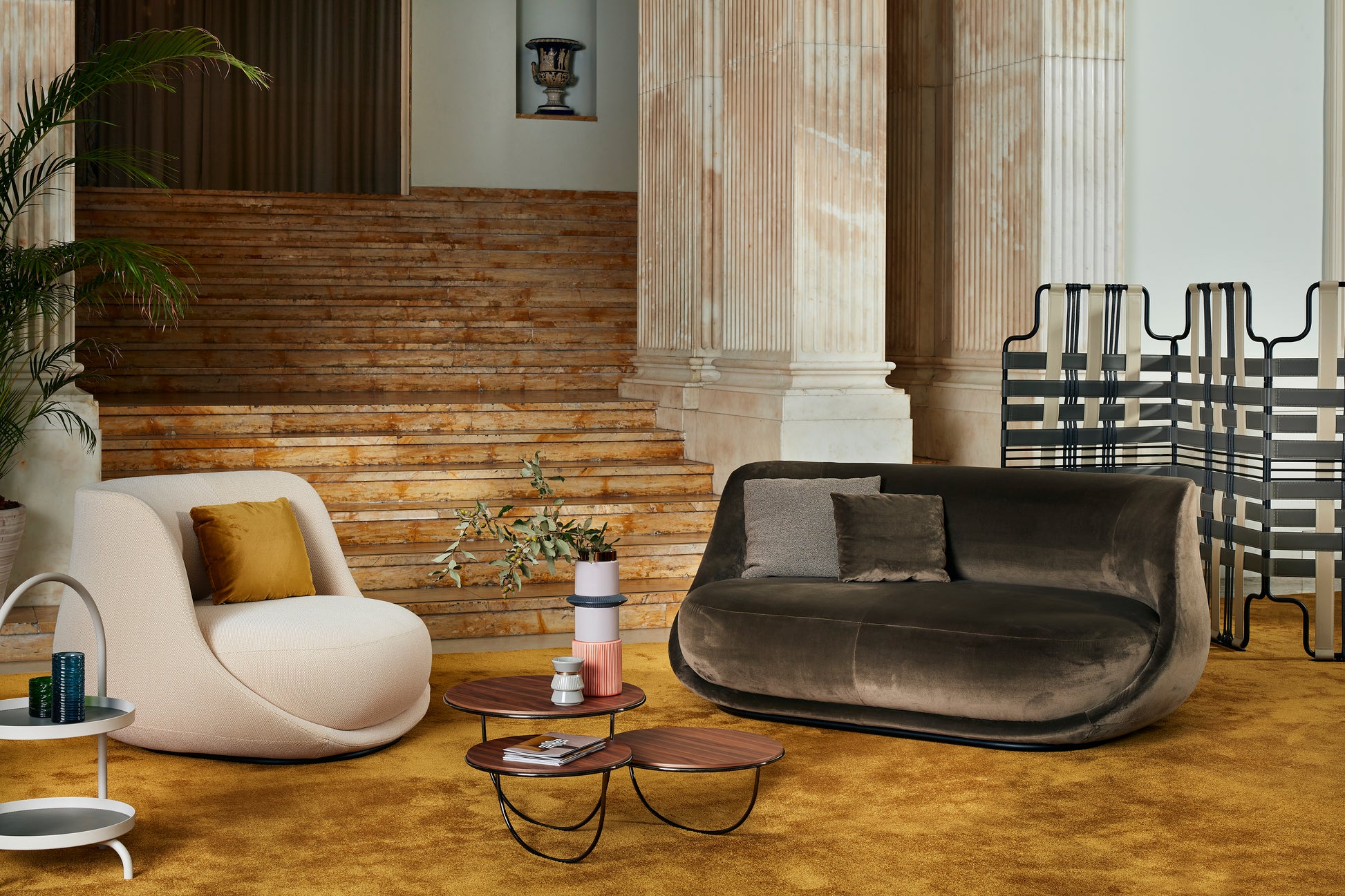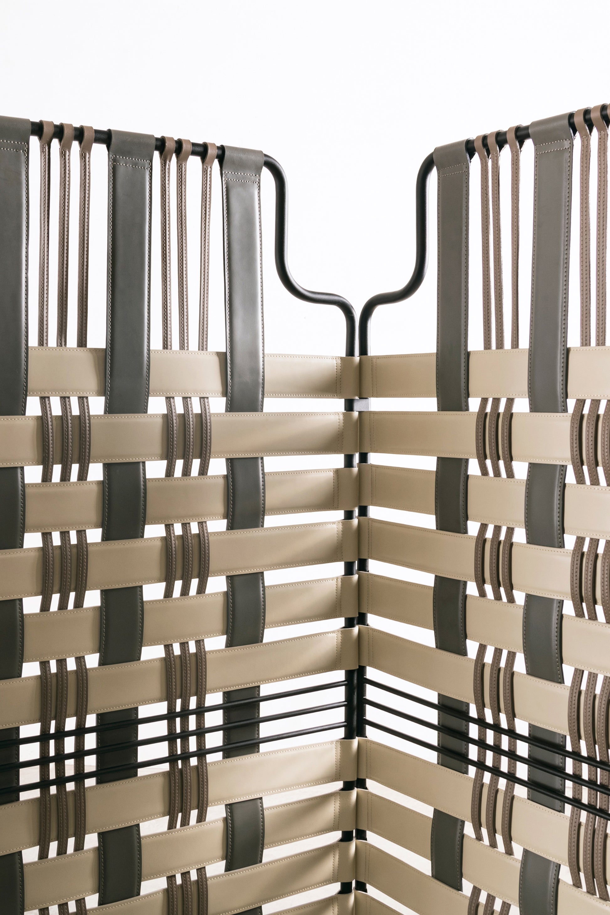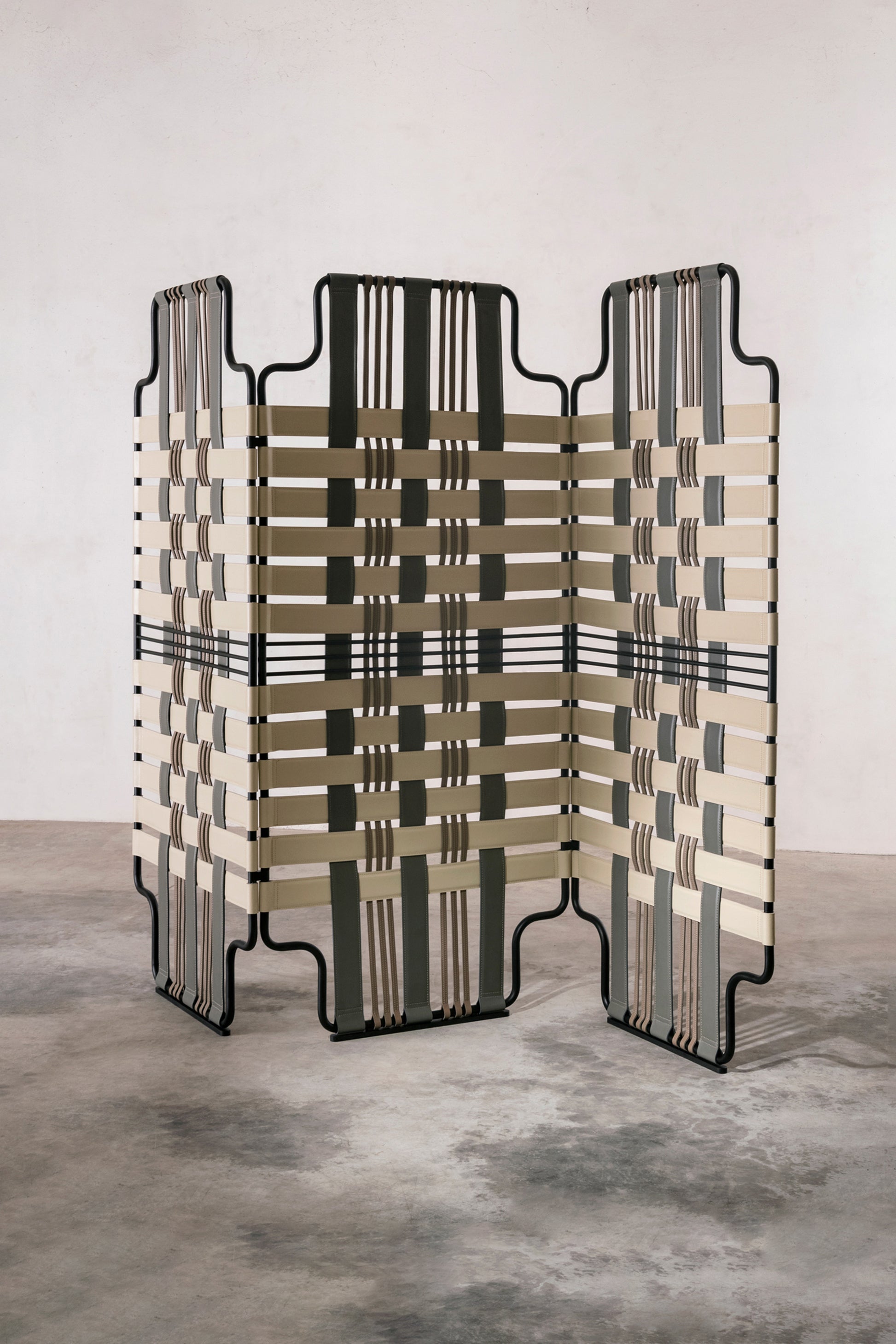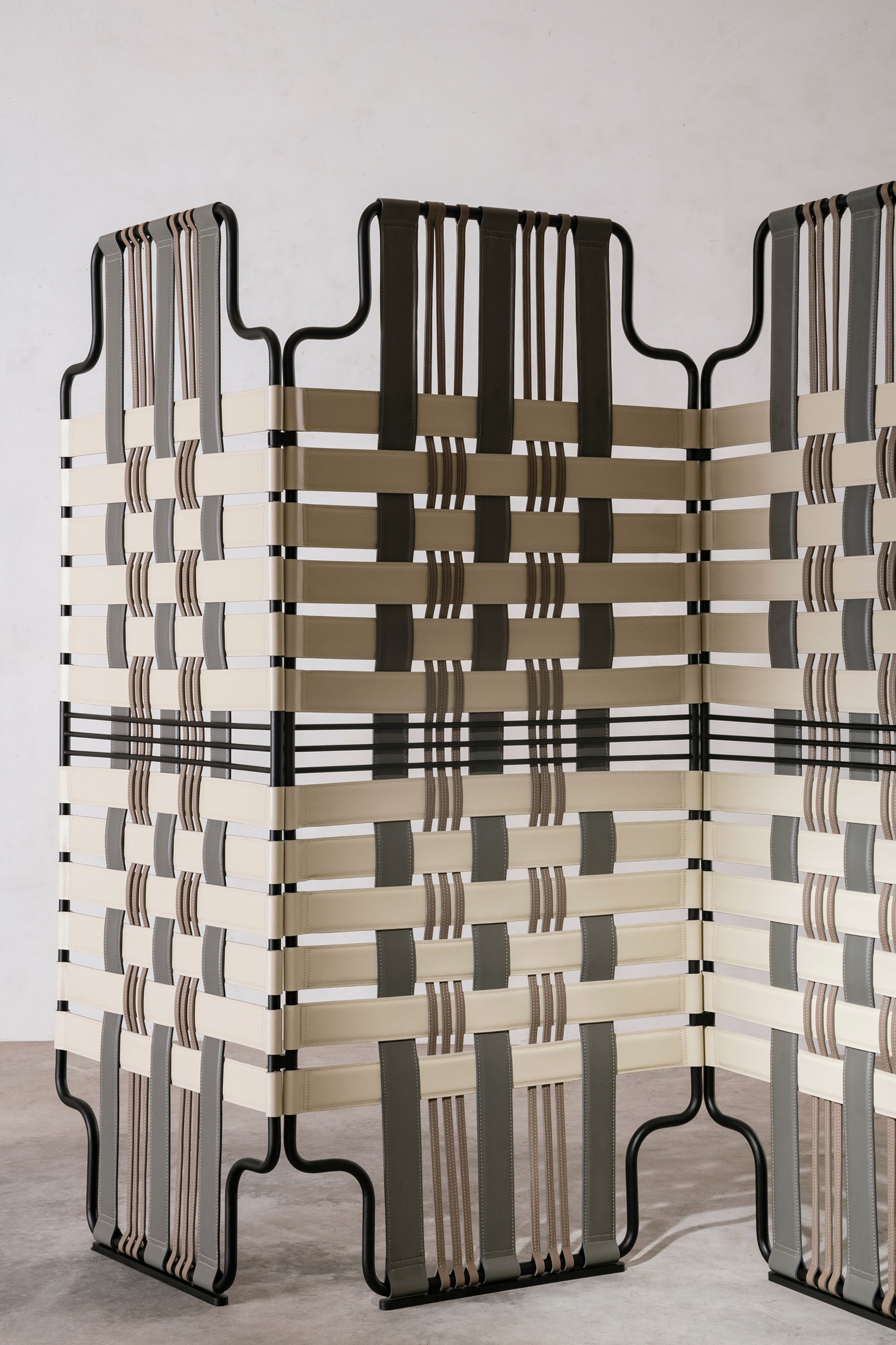 L'attrait du paravent Venier réside d'abord dans sa qualité décorative, avant même de considérer sa fonction. Les bandes de cuir coloré qui s'entrecroisent contre la structure métallique créent un effet géométrique inhabituel et une impression de mouvement. Le travail de tissage minutieux et l'attention portée à la qualité des matériaux renforcent son aspect pratique et son aura agréable. De manière décorative, Venier suggère une division au sein d'une pièce sans pour autant s'effacer complètement.